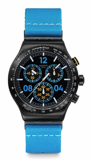 Questo cronografo sportivo presenta un quadrante nero con finitura spazzolata soleil, indici stampati in bianco che si illuminano al buio e numeri stampati in blu e giallo. Le lancette delle ore e dei minuti nere che si illuminano al buio e la lancetta dei secondi bianca indicano l'ora. La cassa in acciaio inossidabile spazzolato con PVD nero è completata da una lunetta in tinta con scala tachimetrica incisa in bianco. Completano l'orologio un cinturino in tessuto blu con passanti e mezza fibbia in acciaio inossidabile spazzolato, entrambi con PVD nero.