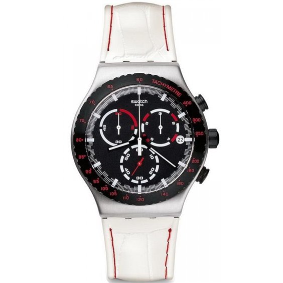 Marchio SWATCH dal 1983 leader mondiale della categoria. Orologio della linea New Irony Chrono, con cassa in acciaio da 43.00mm di diametro, cinturino in gomma e movimento con data e funzione di cronografo. Materiali ipoallergenici. Resistente all' acqua, agli urti, precisione al quarzo. SWISS MADE. Scatola originale e due anni di garanzia ufficiale SWATCH.