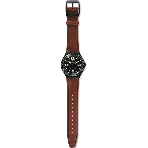 SPECIAL UNIT è uno Swatch maschile e grintoso, caratterizzato da una cassa in acciaio spazzolato nero che racchiude un quadrante nero con dettagli XL bianchi e una lunetta decorata. Il cinturino è in cuoio marrone con impunture nere e fibbia in acciaio spazzolato nero.