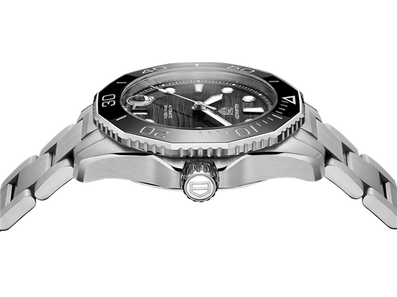 Uno strumento professionale per le profondità marine. Alimentato dal movimento automatico Calibre 5, il TAG Heuer Aquaracer presenta un quadrante nero con finiture ondulate. Grazie alla nuova cassa sottile con bracciale affusolato e fibbia regolabile è perfetto per qualsiasi avventura.