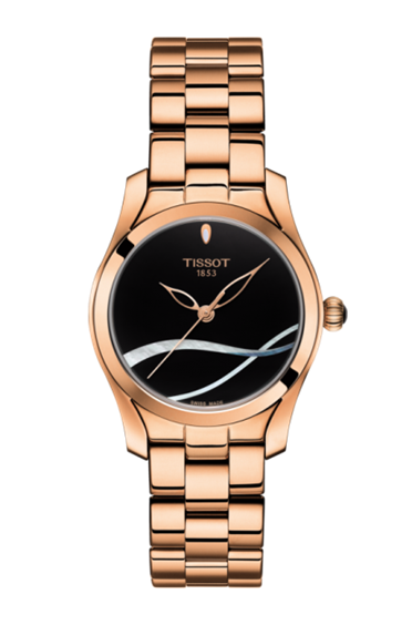 Orologio donna solo tempo, cassa e cinturino in acciaio placcato oro rosa, quadrante nero, vetro zaffiro, impermeabile 3 bar (30 metri), movimento al quarzo con batteria.
