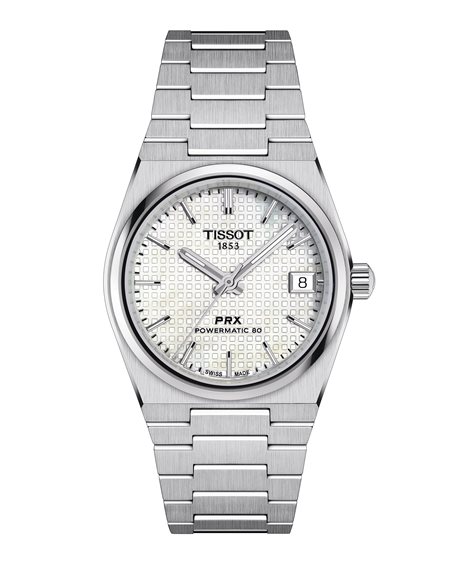 Tissot PRX 35mm Powermatic 80, una magistrale combinazione di fascino classico e raffinatezza moderna. Questo orologio da 35 mm presenta una cassa in acciaio di alta qualità e un affascinante quadrante in madreperla bianca, che rende omaggio alle sue origini del 1978. Il sottile motivo a quadrante waffle conferisce un fascino più versatile e unisex rispetto a quello tipicamente associato ai design in madreperla. Con una resistenza all'acqua fino a 100 metri e una spirale del bilanciere Nivachron™, il PRX è perfetto per coloro che apprezzano l'arte dell'orologeria. Il bracciale in acciaio satinato con chiusura déployante a tripla lama in acciaio garantisce il massimo comfort. Migliora il tuo stile con il Tissot PRX 35mm Powermatic 80 in madreperla bianca.