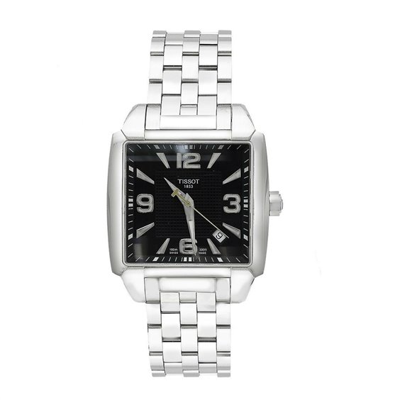 Orologio Tissot unisex di forma quadrata, con cassa in acciaio lucido e spazzolato, quadrante nero con numeri romani 3-6-9-12 e indici in acciaio, datario al 4, lancetta secondi in giallo, movimento al quarzo swiss made, vetro zaffiro, impermeabile a 100 mt. Bracciale in acciaio maglia panthere. Garanzia due anni