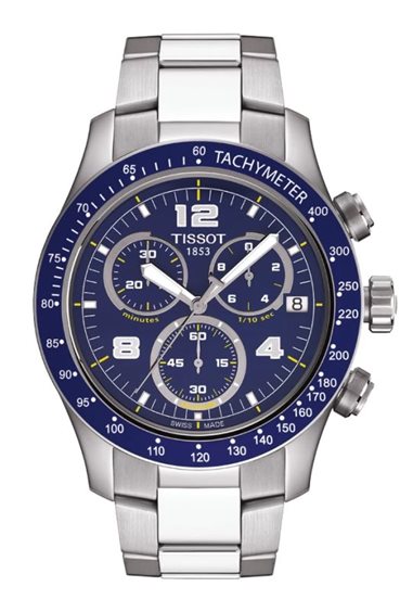 Orologio V8 con cassa e bracciale in acciaio,vetro zaffiro e movimento al quarzo. Il Tissot V8 è un potente motore al polso. Gli audaci cronografi si inseriscono con sicurezza nella gamma di prodotti Tissot con i loro contatori ispirati ai cruscotti, con i numeri in caratteri moderni chiaramente visibili alle ore 12, 4 e 8 e le lunette tachimetriche. I modelli Tissot V8 si rivolgono a coloro che amano una vita ad alto tasso di adrenalina e detestano rimanere fuori dall'azione.
