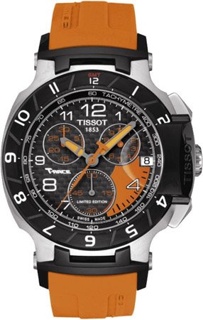 Caratteristiche Linea: T-Race LIMITED EDITION Marca: Tissot Orologio: Cronografo Movimento: Quarzo Swiss Made Funzioni: Datario, lunetta girevole antioraria con funzione GMT Cassa: Forma rotonda, dimensioni 45.3 mm x 50.26 mm, Acciaio PVD nero Vetro: Zaffiro antigraffio Fondello : inciso MOTO-GP Quadrante: Nero con fibra di carbonio e lancette con trattamento superluminova Cinturino: Gomma arancio Chiusura: Deployant e pulsanti impermeabilità : 100mt