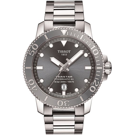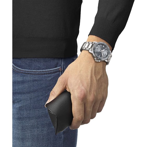 Orologio Swiss Made da uomo Tissot collezione T-Sport Seastar 1000 Powermatic 80 Cassa in acciaio 316L da 43mm. Quadrante grigio con datario e indici. Lunetta in ceramica antigraffio e anti rotazione. Movimento svizzero automatico a vista Powermatic 80.111 con riserva di carica fino a 80 ore. Fondello e corona a vite. Bracciale in acciaio con chiusura deployante con chiusura di sicurezza per immersione. Vetro zaffiro antigraffio. Peso 184g. Impermeabile fino a 30 bar.