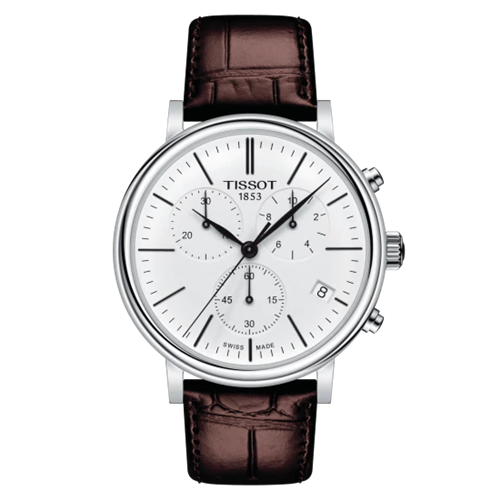 Orologio Uomo Cronografo. Cassa in acciaio 316L lucido diametro 41 mm. spessore 10,2 mm. ansa 20 mm. Movimento Swiss made Crono Quartz ETA G 10.212 Powerdrive: ore/minuti/secondi/data. Contatori crono 1/10sec. 30min. secondi crono al centro. Vetro zaffiro. Quadrante bianco, indici e lancette lucide brunite. Cinturino in pelle marrone stampa alligatore. Impermeabile 5 bar(5 atm.) Peso 60 grammi. Scatola e libretto istruzioni originale. Garanzia Internazionale 2 anni . Tissot Carson Premium Cronograph un modello intramontabile da indossare sempre e in qualunque occasione.