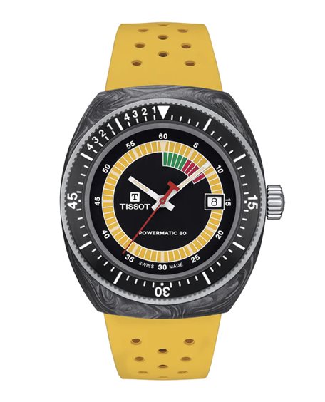 Tissot propone questo modello Sideral Powermatic 80 con cassa che misura 41 mm di diametro ed ha una linea a barile. Il movimento del Sideral è un Tissot Powermatic 80 che offre appunto 80 ore riserva di carica. Vetro zaffiro bombato antigraffio con rivestimento antiriflesso. Cassa in acciaio inossidabile 316L con carbonio forgiato marmorizzato nero e grigio.