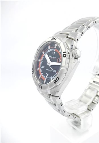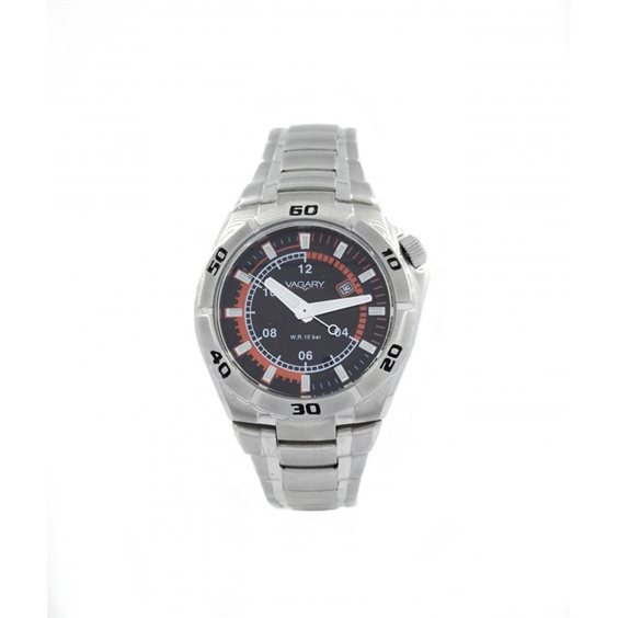 Orologio bambino Vagary referenza IE6-317-51. Alimentazione Al quarzo - Display Analogico. Orologio con cassa rotonda in acciaio 34 mm, quadrante nero con dettagli arancioni, lancette ed indici luminescenti. Secondi al centro. Datario e corona ad ore 2. Lunetta fissa incisa ogni 10 minuti con numeri arabi neri. Vetro minerale. Bracciale in acciaio con chiusura deployante personalizzata Vagary. Fondo serrato a vite. WR 10 BAR.