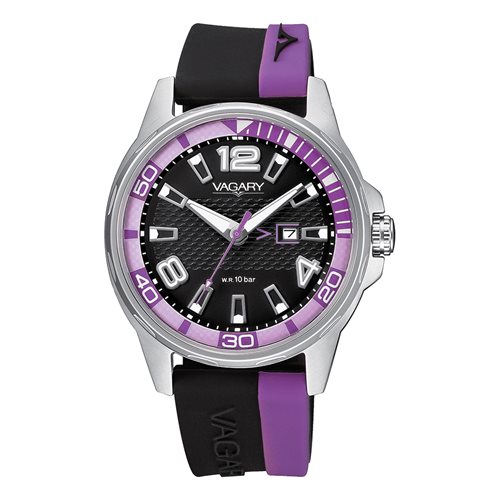Orologio ragazza Citizen, movimento al quarzo, cal. 6010. Cassa in acciaio. Cinturino in silicone nero e viola. Fondo serrato a vite. WR 10 bar. Diametro cassa 36 mm.