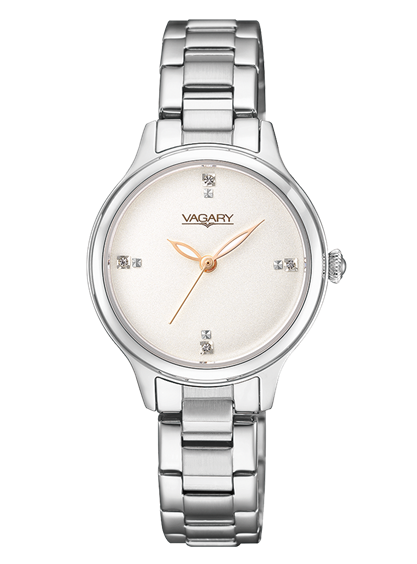 Orologio Solo Tempo Di Vagary Da Donna Della Collezione Flair. Modello Con Cassa In Acciaio.Diametro 28Mm. Questo Orologio Ha Quadrante Bianco Con Cristalli, Bracciale In Acciaio Con Chiusura A Pulsante E Vetro Minerale. La Resistenza All'Acqua È Di 5 Atm. Questo Modello Si Caratterizza Per Movimento Di Tipo Al Quarzo Citizen Cal 6010. Funzioni Dell'Orologio: Solo Tempo. Datario