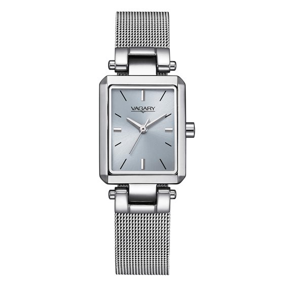 Vagary - collecione Flair. Cassa in acciaio dal diametro di 21,5 x 27 mm. Quadrante finitura soleil in azzurro ghiaccio. Indici e lancette su tono cassa. Vetro minerale piatto. Movimento al quarzo con funzione solo tempo. Bracciale in Maglia Milano su tono cassa con chiusura gioielleria. Impermeabilità: 5 ATM.