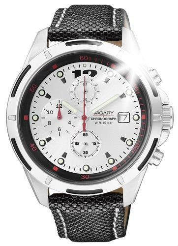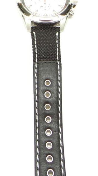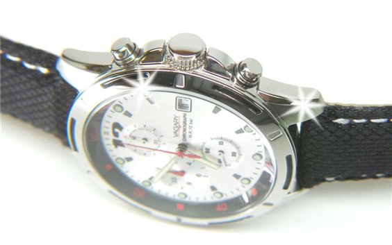 Carattersitiche tecniche cronografo con movimento al quarzo Citizen, cal. 0F10, vetro minerale, fondello serrato con viti, diametro cassa 42 mm. cinturino in tessuto tecnico e pelle nero e cassa in acciaio, quadrante silver con particolari rosso e nero, datario a ore 3, sfere e indici louminuos. WT 100 m.