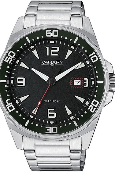 Orologio solo tempo dauomo di vagary della collezione di aqua 39. Cassa in acciaio con fondo serrarto a vite diametro cassa 42,5mm, quadrantenero con indici e sfere chiari, bracciale in acciao integrato con chiusura a pulsante. Orologio con resistenza all' acqua di 10 atm. Movimento al quarzo citizen con datario e con vetro minerale.