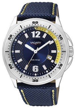 Vagary uomo/ragazzo con movimento al quarzo, cassa in acciaio mm 41, quadrante con sfere luminescenti e datario al 4, corona a pressione e fondo wr 10 bar. Cinturino in tessuto blu con inserto finale in pelle, cuciture gialle e fori di regolazione in acciaio