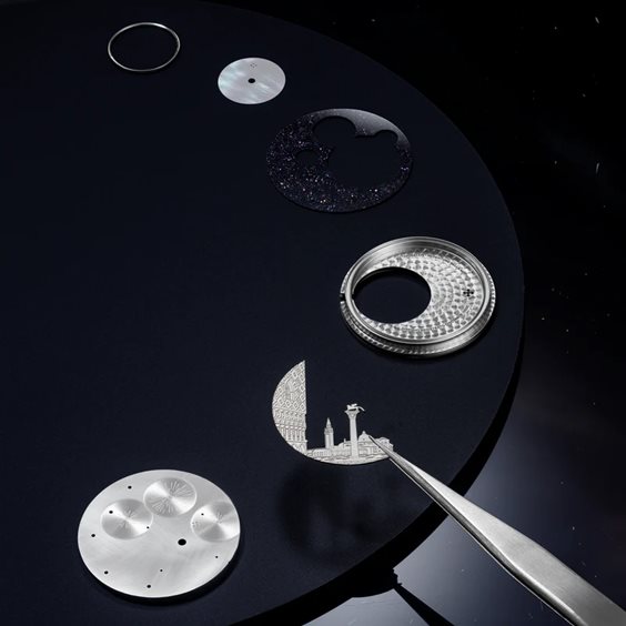 Il quadrante dell'orologio è un'evocativa rappresentazione della celebrazione del Redentore a Venezia. All'interno della composizione, Piazza San Marco prende vita nella notte, con la maestosa Basilica di San Giorgio Maggiore che si staglia sullo sfondo e il Palazzo Ducale sulla sinistra. Al centro della scena, il leone di San Marco si erge fiero, simbolo del potere della Serenissima. La notte stellata avvolge il tutto, offrendo una cornice magica e suggestiva per i fuochi d'artificio che illuminano il cielo, creando un'atmosfera di festa e gioia.