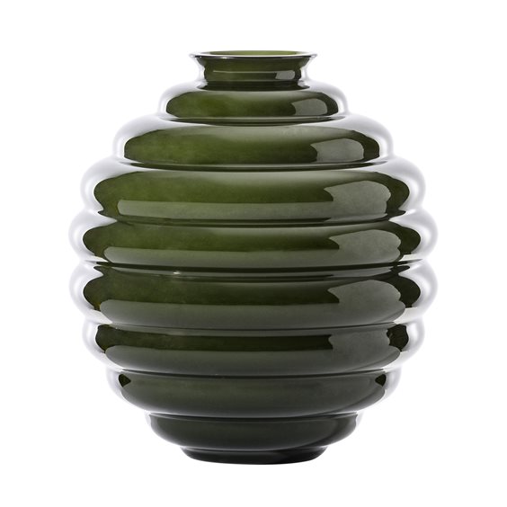 CARATTERISTICHE ALTEZZA: 24,5 cm DIAMETRO: 23 cm PESO UNITARIO: 2,15 kg SOFFIATO OPALINO Ottenuto dalla sovrapposizione del lattimo con altri vetri, il vetro opalino è soffiato e lavorato a mano. “Ritmo: è questa la parola che definisce la forma dei vasi della serie Dèco di VENINI. Gli anelli si ripetono, uno dopo l’altro. Aumentano, diminuiscono, poi aumentano nuovamente. Sembrano muoversi come cerchi nell’acqua con onde e riflessi. Un movimento che è una danza.”