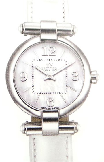 Orologio solo tempo, movimento Miyota 2025 quarzo. Cassa in acciaio lucido diametro 30 mm. Quadrante madreperla con indici e numeri arabi applicati, cabochon in quarzo bianco su ansa e corona, vetro zaffiro. W.R. 10 atm, cinturino in pelle bianca verniciata lucida.